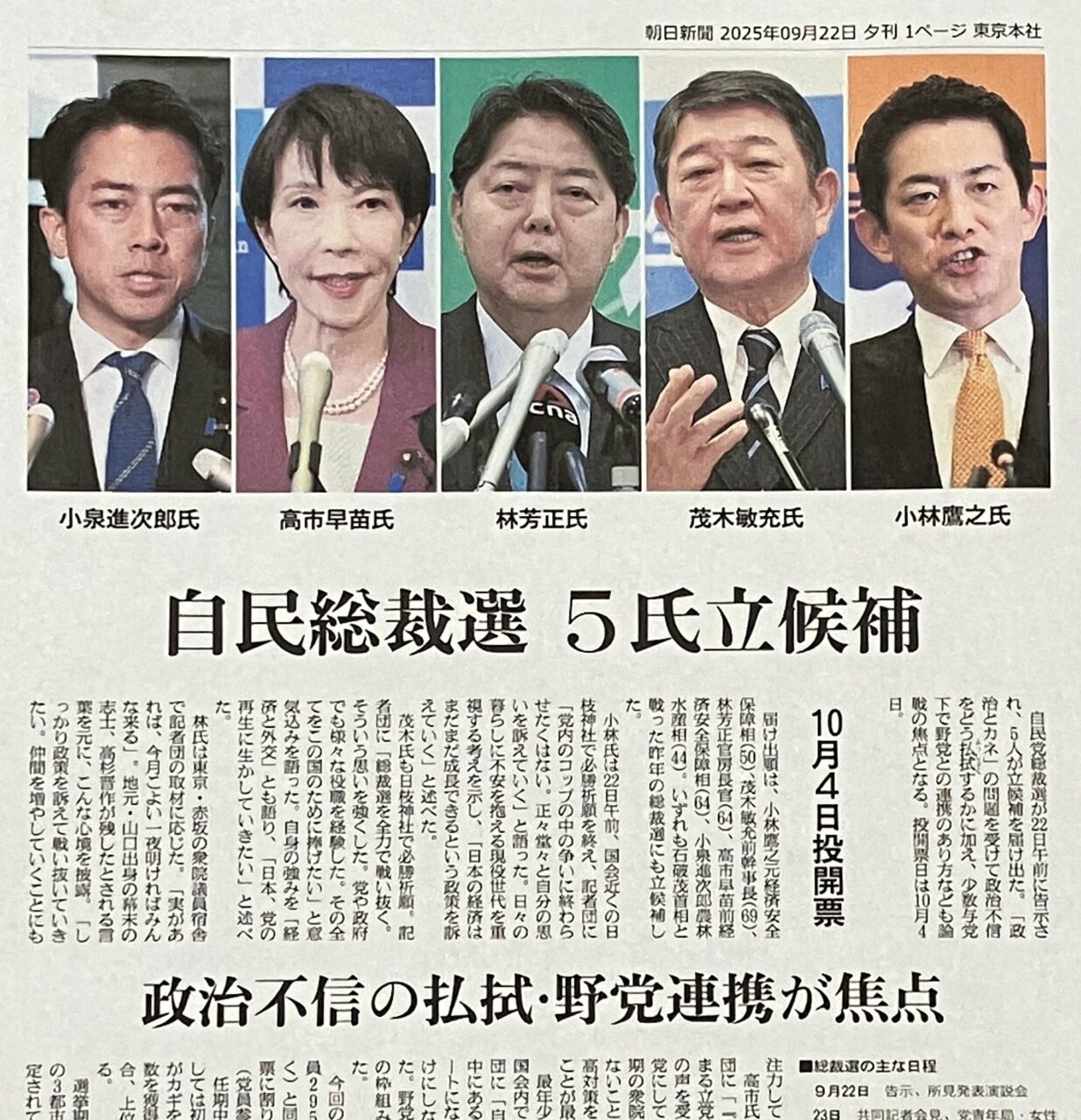 ◎自民総裁選に5人出馬 小林鷹之氏 茂木敏充氏 林芳正氏 高市早苗氏 小泉進次郎氏 | NHK →自民党総裁選が始まった。5人の主張は昨年の総裁選より似ていると言われるが、党本部での立会演説会では個性の違いも目立った。24日の日本記者クラブ討論会など各種イベントがあり、資質が試される。思わぬ得点や失言も影響しそうだ。かつては「メディア・ジャック」と言われたが、少数与党の総裁選でメディアの対応も問われる。