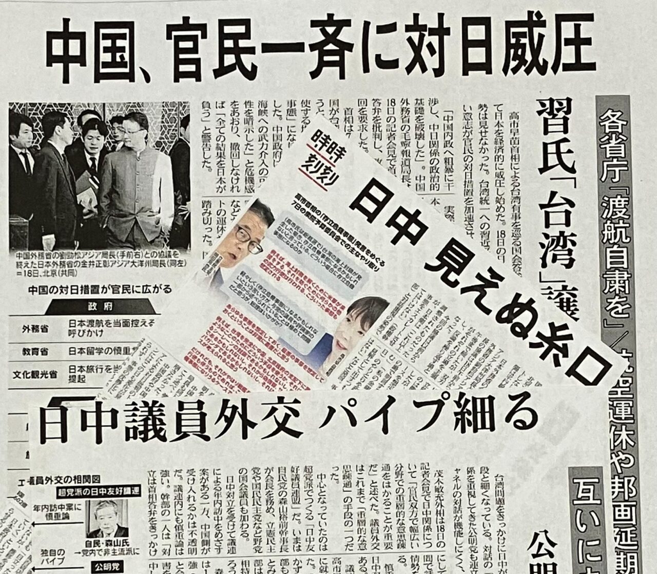 ◎外務省担当局長 中国側と協議 日本の立場説明 | NHKニュース →習近平主席は台湾統一を自らの歴史的使命と信じている。トランプ政権の関税引き下げにも屈しない習主席が、外務省局長の説明程度で妥協する気はない。二階氏らの親中派や中国政府にパイプを持つ公明党がいない今のタカ派政権は、有効な打ち手がない。高市発言を撤回しない限り、日中関係の悪化は年単位で続く覚悟が必要だ。高市政権のつまずきの始まりになるだろう。