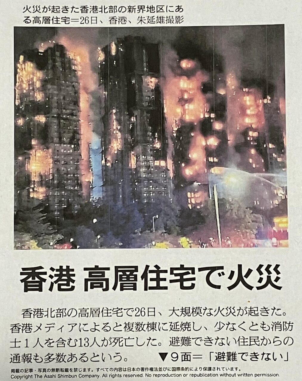 ◎香港 高層住宅火災 146人の死亡確認と発表 地元当局 | NHKニュース →香港のマンション火災の死者は146人にのぼっている。住民側は去年から火災の危険性への懸念を当局に伝え、当局は16回にわたって現場確認をしたが防げなかった。当局追及の動きも出ているが、治安機関は「混乱たくらめば厳罰」と威嚇している→ 治安機関は「混乱たくらむもの厳罰受ける」 | NHKニュース