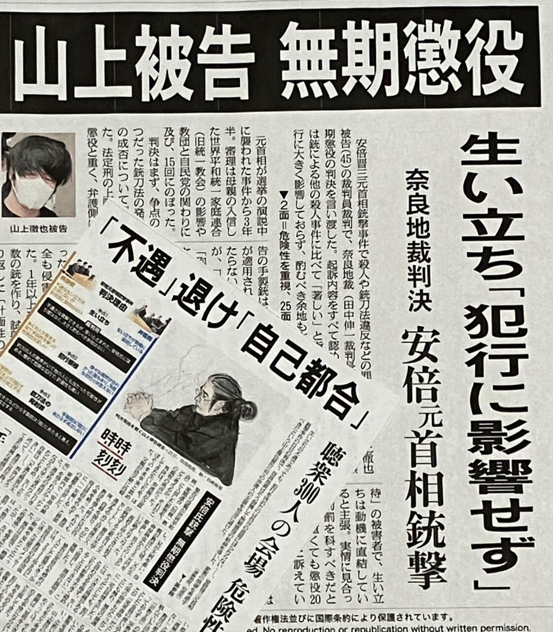 ◎山上徹也被告に無期懲役の判決 安倍晋三元首相銃撃事件裁判 | NHKニュース →奈良地裁は山上被告に求刑通り、無期懲役を言い渡した。情状が注目されたが、「殺人に不遇な生い立ちが大きく影響したとは認められない」とした。厳しく非難されるべき犯行だが、生活苦で絶望を感じたことは容易に想像できる。安倍元首相が祖父の岸信介氏の代から旧統一教会系と関係していたことは明白だが、判決はすべて検察の主張通りで、やや冷たい。